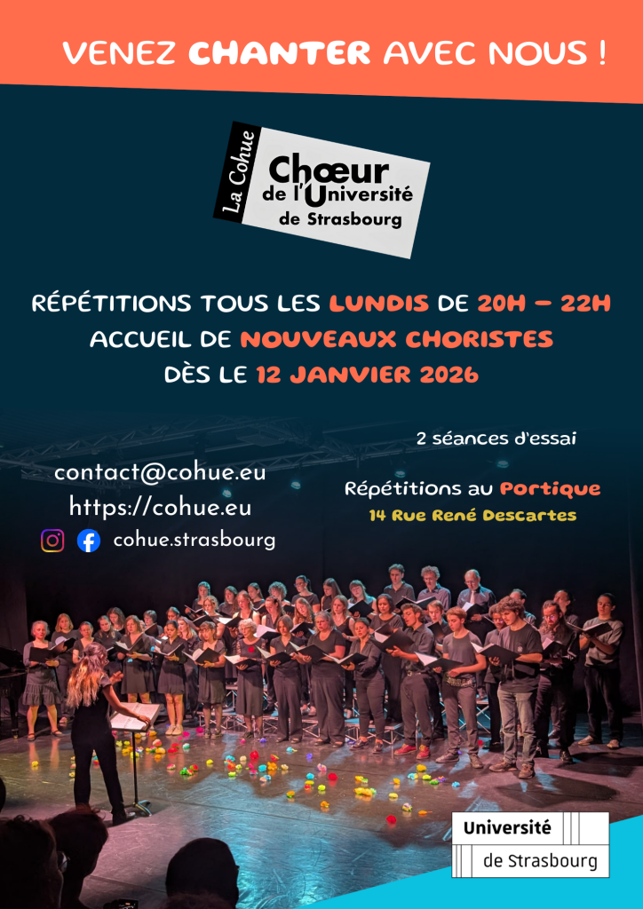 À l’occasion de ce nouveau semestre, nous accueillons avec plaisir de nouveaux choristes au sein de l’ensemble. Notre première répétition de l’année 2026 aura lieu le lundi 12 janvier à 20h au Portique. [Nous rejoindre]